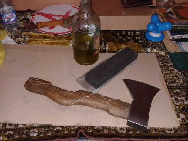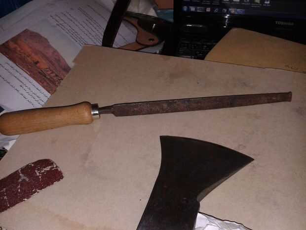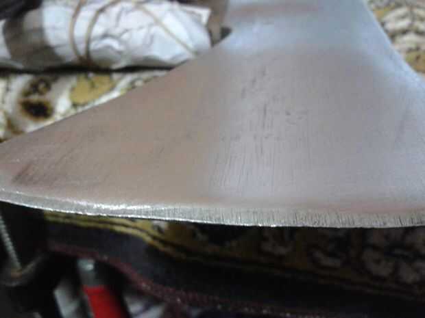Utilicé papel de lija grueso y suave para dar la cabeza de un brillante y limpiarlo, y con una lima Bastarda archivo el borde para que se ejecute en una línea uniforme, entonces afilar en una arenisca gruesa que lado liso alrededor de una hora para que sea más fuerte.
