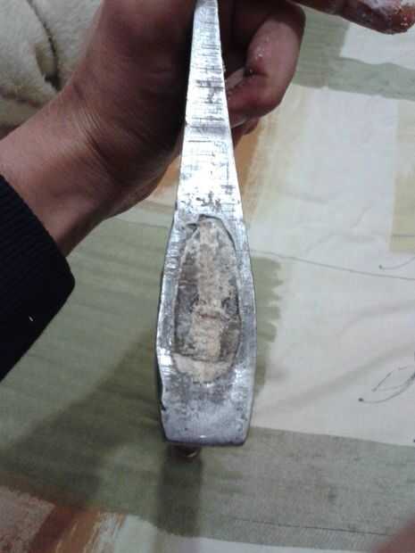 - Coloque la cuña en el mango, empezar empujando cuidadosamente a través de él con un martillo, se rompen fácilmente ya que es delgada de la parte inferior, así que ten cuidado.