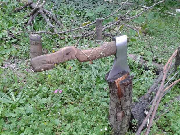 Como dije antes, el hacha no es apropiado para trabajos pesados, porque la cabeza del hacha no es de mejor calidad por desgracia, cuando debo pegar un tronco perpendicular a las vetas de la madera con la fuerza máxima, el filo se embota y no mantener la forma y la nitidez, por lo que lo uso sólo para la división de registros y corte de ramas y arbustos espinosos y un elemento decorativo en nuestro salón!