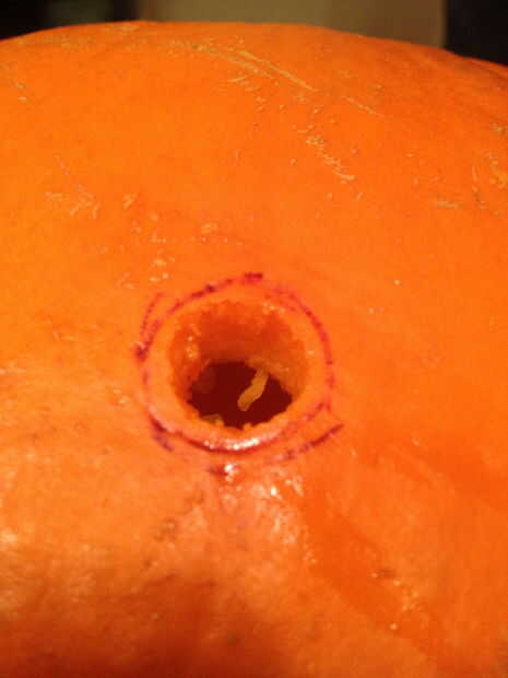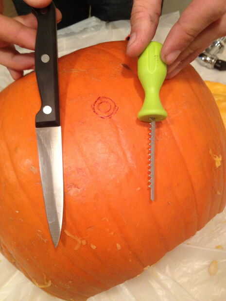 Usar un pequeño cuchillo calabaza para hacer el agujero a lo largo de la línea que trazaste. Cualquier cuchillo pequeño de cocina o cocina debe hacer así. Utilice un dedo para empujar el agujero por si es necesario.