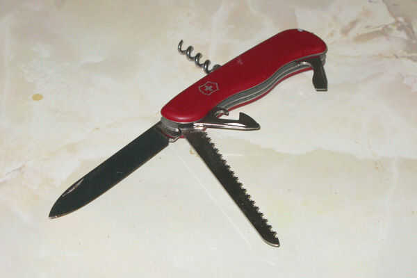 La navaja. Mi fiel mochila Victorinox. Tiene una sierra muy práctica y perfecta para el corte de una caña si veo uno en la mesa de trabajo.