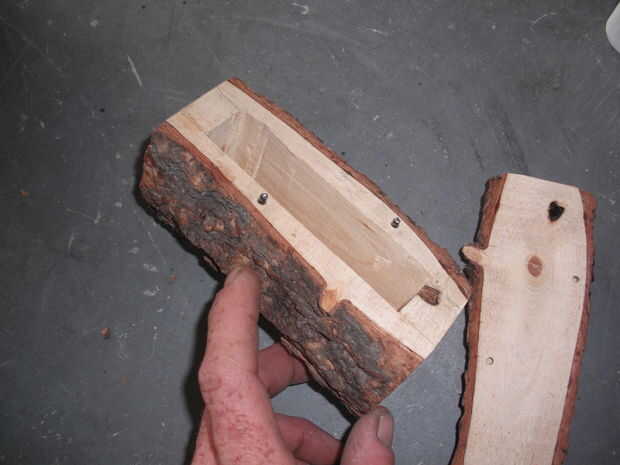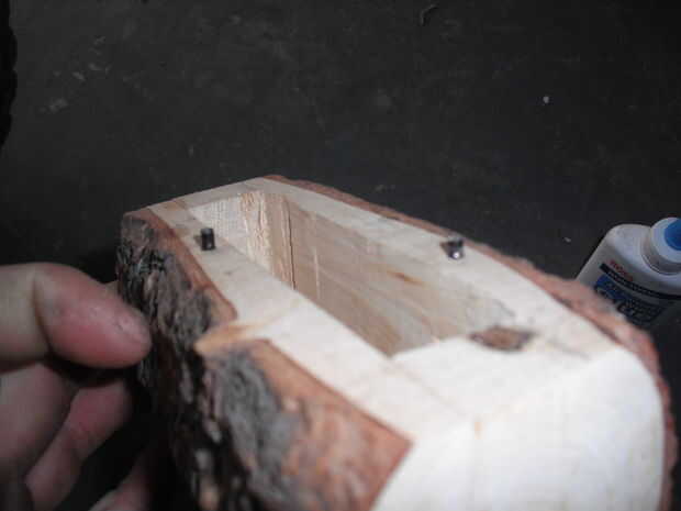 Una vez que el pegamento seca casi listo. También mantener la tapa, inserto 2 clavijas pequeñas en la pieza superior. Perfore unos agujeros en el mismo lugar en ambas piezas y aplicar un poco de pegamento para fijar los tacos. Whallah... poner llaves, una nota, o lo que quiere dentro y se esconde en arbustos o en otro lugar discreto.