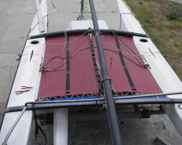 la semana pasada lanzó a mi Hobie 16 con tela sunbrella. Aquí es un método similar para mi Hobie 18 años usando material de lona de camión PVC/poliéster pesado.