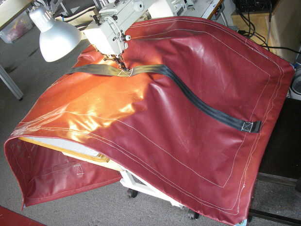 Los footstraps en el viejo vagabundo eran tiro, usé un trozo de cinturón de seguridad. Hay parches de refuerzo de tela en la parte inferior del vagabundo para mantener la sutura de tracción a través de cuando se apoderó de wipeouts.