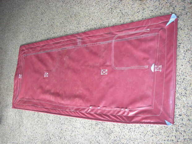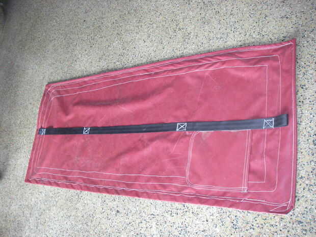 este método envuelve Sunbrella tela alrededor de los ojales antigua para que no tenga que hacer cualquier grommeting. Este catamarán es un Hobie 16.He utilizado un método similar para volver a caminar mi Hobie 18 con lona de camión de PVC y poliéster