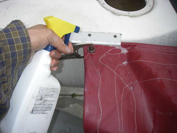 este método envuelve Sunbrella tela alrededor de los ojales antigua para que no tenga que hacer cualquier grommeting. Este catamarán es un Hobie 16.He utilizado un método similar para volver a caminar mi Hobie 18 con lona de camión de PVC y poliéster