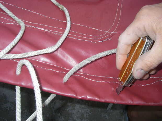 este método envuelve Sunbrella tela alrededor de los ojales antigua para que no tenga que hacer cualquier grommeting. Este catamarán es un Hobie 16.He utilizado un método similar para volver a caminar mi Hobie 18 con lona de camión de PVC y poliéster