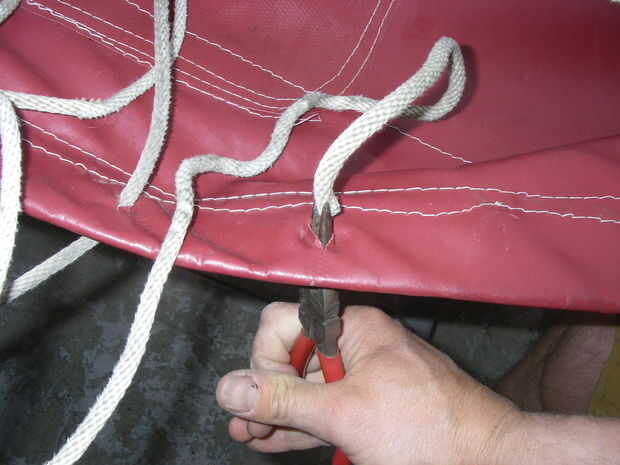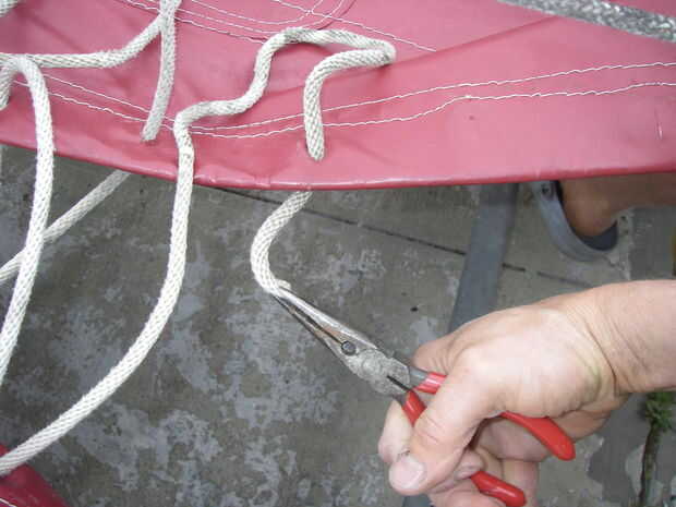 este método envuelve Sunbrella tela alrededor de los ojales antigua para que no tenga que hacer cualquier grommeting. Este catamarán es un Hobie 16.He utilizado un método similar para volver a caminar mi Hobie 18 con lona de camión de PVC y poliéster