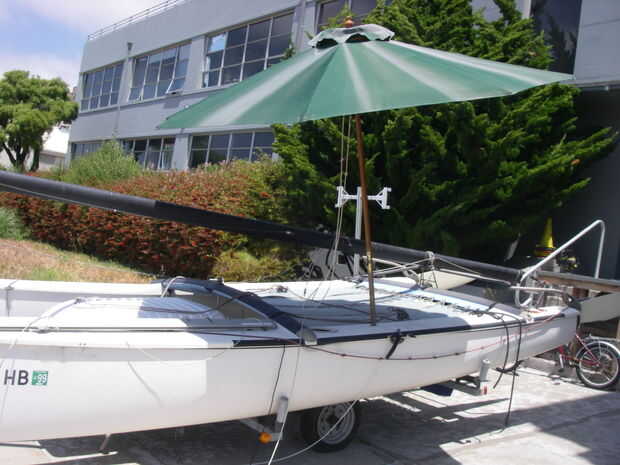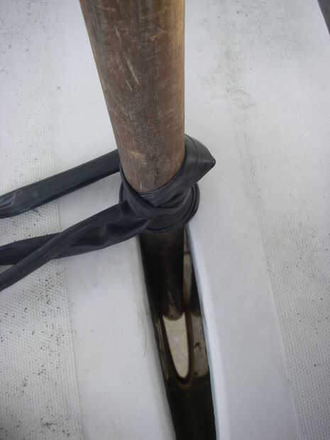 este método envuelve Sunbrella tela alrededor de los ojales antigua para que no tenga que hacer cualquier grommeting. Este catamarán es un Hobie 16.He utilizado un método similar para volver a caminar mi Hobie 18 con lona de camión de PVC y poliéster