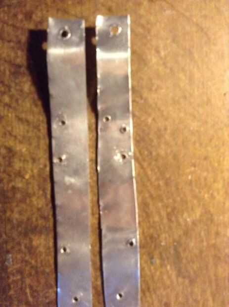 Lo primero que tienes que hacer es cortar x2 10 "x 1" (la longitud de su brazo más bajo, obviamente que oscila) también necesita perforar 6 agujeros en ellos como se muestra en la imagen. Luego cortar 4 5 "x 1" (un poco más largo que el ancho de su brazo) y 1 3.5 "x 1". Perfore agujeros en los extremos como se muestra en la imagen para que coincida con el agujero opuesto en las tiras de metal largo. Debería ver algo como la foto 3.