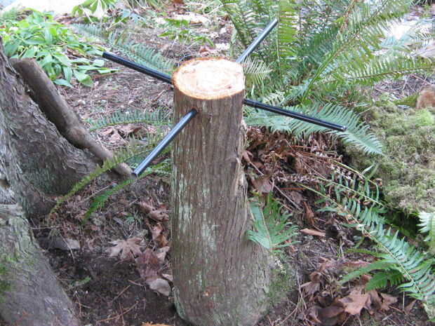 Si usted ha usado un paraguas grande hacer una seta enorme, necesitará apoyo. Ubicar cuatro varillas metálicas (barras, barras del viejo Zapatero, etc.) y cuatro orificios, aproximadamente 6" desde la parte superior de su base. Asegúrese de comprobar el perímetro de su paraguas. Sus barras de metal necesitan apoyar los bordes exteriores de su seta sin empalar a los huéspedes jardín curioso.