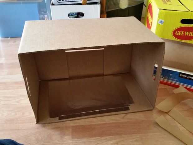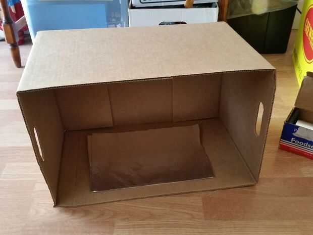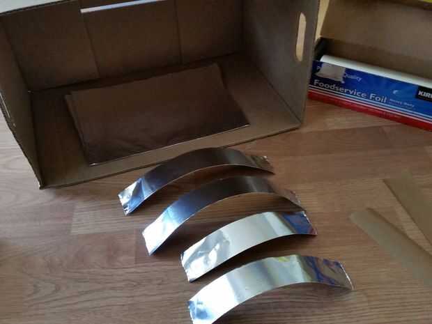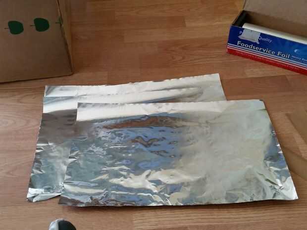 Utilizando la pieza interior de la caja como se muestra en la primera foto, consulte la zona marcada con la 'X'. Esta es la zona donde se concentra todo el calor del horno. Corte 5-12" las secciones de la hoja de 18" de ancho. Alinee la hoja y doblar por la mitad. Utilice 4-6" piezas de cinta de aluminio para fijar la lámina a la parte inferior del horno.