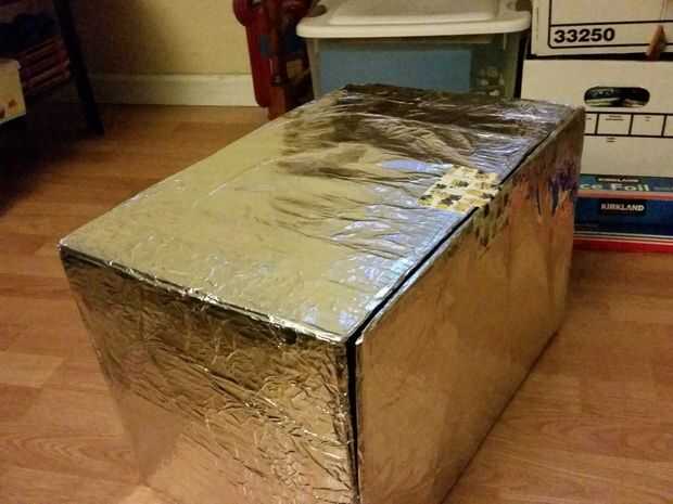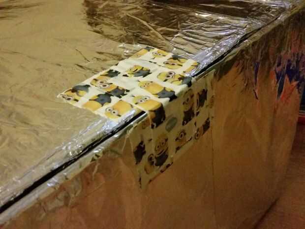 El horno se sienta con la solapa de apertura para colocarlos extendidos sobre el suelo. Me gusta la cinta de minion, así que corte 3 4" piezas. Poner en la pieza en la tapa, uno en la parte superior, y uno conectado los dos. Este horno debe tener un hueco cuando se pone en el carbón de leña de gases.