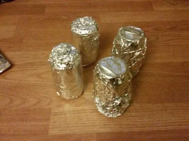 Para este paso necesita aluminio vacío 4 latas, 4 - 6 "x 18" ancho pedazos de hoja, arena o frijoles, pequeña parrilla, charola de aluminio y dos bandejas de pasteles de apilables. Primero llene las latas de 1/2 - 2/3 lleno de frijol tipo pinto o arena. Luego la cinta la parte superior de la lata con 2" pieza de cinta de aluminio para asegurarse de que los granos y tal no caer. Envuelva las latas con papel de aluminio y asegure con cinta. Plegar los extremos de las latas y dejar de lado. Poner las cacerolas de la empanada en el horno y colocar las latas en una plaza. Coloque la parrilla sobre las latas. Cuando los carbones han sido calentados, poner en la tartera. Carbones calientes son 50 grados, así que añadir tantos como necesita para que la temperatura de cocción correcto para lo que usted suceda hacer. El horno de la caja se calienta en la parte inferior, así que ten cuidado si la mueves si directamente después de la cocción.