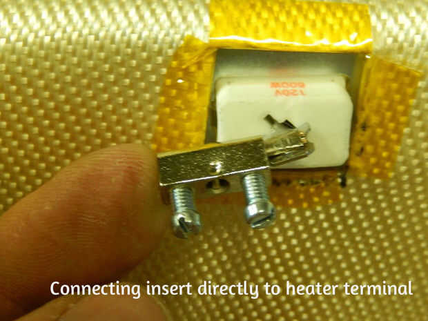 Pero estaba equivocado. El cableado existente fue prensado directamente a los terminales del calentador (en lugar de un terminal de presión que affiixed luego a los terminales del calentador). Una opción habría sido intentar alzaprimar abierto engarce existente y conectar mi nuevo cableado. Me preocupaba que esto haría cualquier riesgo rompiendo el calentador o que no sería capaz de obtener una doble decente.