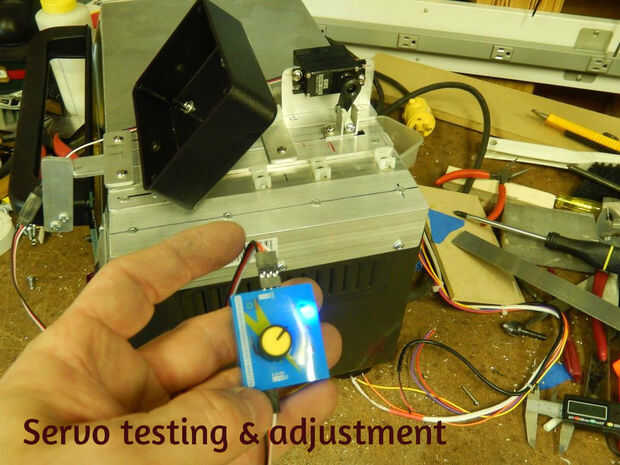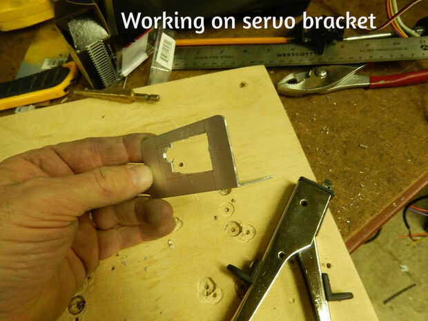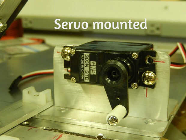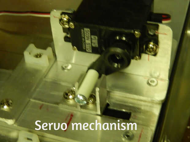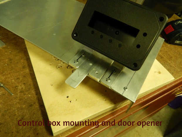 Usé un ángulo de aluminio para hacer un soporte para el servo. Entonces utilicé algunas de las acciones de 3/4" para hacer una palanca que permite al servo empujar la puerta abierta. Esperemos que las imágenes hacen la operación claro para el lector. Este Video lo muestra en funcionamiento. Su puede ser un poco exagerada pero funcionará confiablemente y utilicé cosas que tenía en mi tienda.
