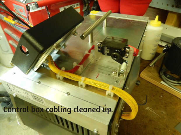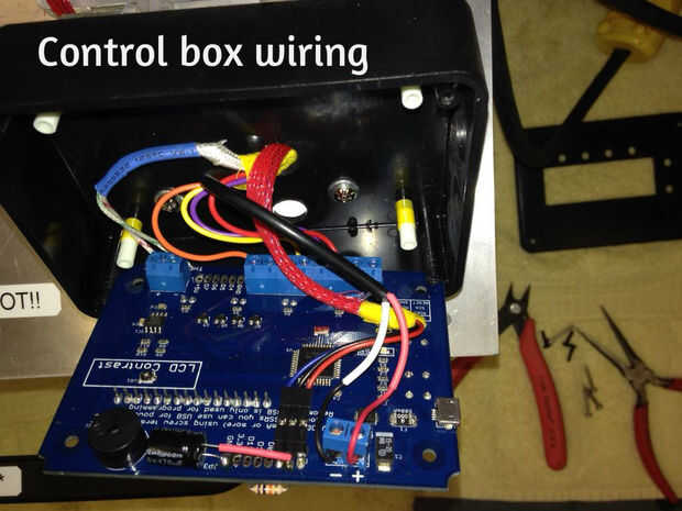 Una vez dejé la puerta servo mecanismo operacional que completé el cableado de los servos y horno a la caja de control. Usé algunas monturas de lazo de alambre y malla mangas para proteger el cableado y hacerlo ver más bonito. Recuerda hacer un agujero en el lado de la caja para permitir el acceso al puerto USB de la tarjeta controladora. Usted tendrá acceso a esta para actualizaciones de firmware y si te sientes particularmente geek puede controlar el horno durante la cocción.