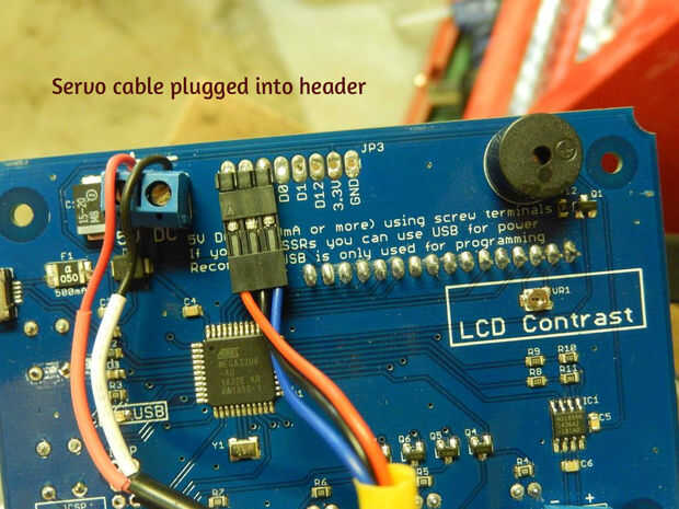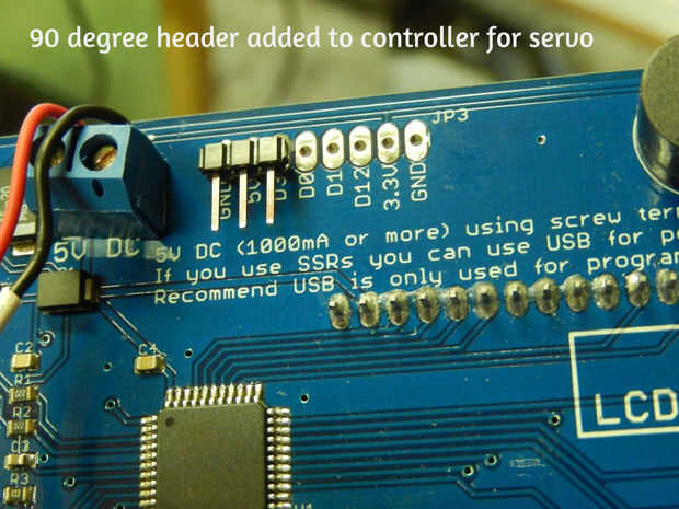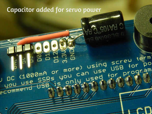 Para utilizar el servo debe hacer algunas adiciones a la Junta de control. En primer lugar, he añadido una cabecera de ángulo recto para coger la línea de control + 5, Gnd y D3. Esto se alinea con las conexiones de servo estándar por lo que se convirtió en fácil atar a un servo (nota en la imagen he utilizado un extensor de cable de 3-pin para el servo y los colores de alambre no son estándar). También se debe instalar un condensador electrolítico extra en el encabezado de servo para permitir la corriente de irrupción del motor servo. Si no lo hace se obtiene con su unidad de control de reposición cuando se mueve el servo. Usé un condensador electrolítico de 470uF 16V. Asegúrese de que usted preste atención a la polaridad.