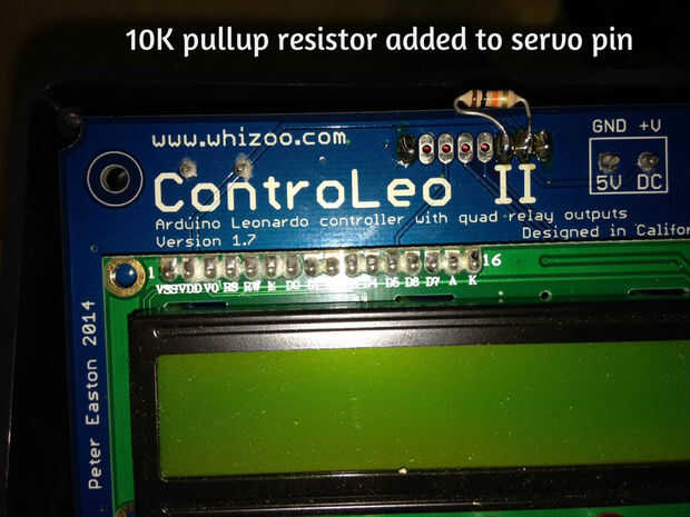 Tenga en cuenta que varios servos tienden a comportarse de forma diferente cuando enciende antes de una señal de control adecuada estando presente (como ocurre durante el proceso de arranque del controlador). Algunos servos están bien, pero algunas (cuando inicialmente encendido) se moverá a una posición incorrecta o perjudicial antes de que el controlador mueve a la posición de arranque configurado. Esto puede ser molesto así que trate de conectar un tire de 10 K resistencia entre la línea de control servo y el carril de + 5. Esta había curado el problema con mi servo.