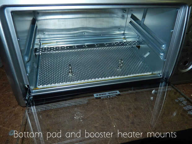 El kit Whizoo viene con una placa aislante con recubrimiento metálico y un calentador del aumentador de presión. El calentador del aumentador de presión asegura el horno se calienta a la velocidad requerida para un perfil de temperatura de reflujo adecuado. Si bien ya había añadido el aislamiento de manta de soldador en la parte inferior también he añadido este botón calcular que más aislamiento sería bueno. El kit también incluye dos pernos de ojo para montar el calentador del aumentador de presión. Se necesita determinar la ubicación de éstos y taladre agujeros en la parte inferior del horno. Los pernos de ojo deben ser en cada extremo del calentador del aumentador de presión (alrededor de 5" de aparte). La parte media de la calefacción obtiene rojo caliente así que asegúrese de que los ojos son justo al final. También puede necesitar usar un par de pinzas para hacer los pernos de ojo del tamaño adecuado para caber firmemente el tubo del calentador. Montara el calentador del aumentador de presión centrado en la anchura del horno (de lado a lado) y unos 2" adelante del radiador de cuarzo. Simplemente centrado en la almohadilla de aislamiento en la parte inferior (es más pequeño que el horno) y taladrar los orificios a través de la almohadilla aislante y la parte inferior del horno. Luego usé las armellas, arandelas, arandelas y tuercas para mantener unida a la Asamblea.