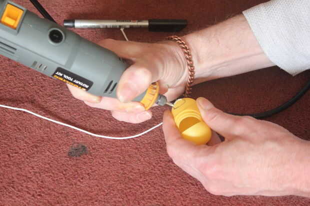 Utilizar su herramienta multiusos Dremel para cortar el contorno hacia fuera y un agujero para la cuerda en la final con el agujero del taladro. Esto hace fácil para kitty llevar sin los dulces caer hacia fuera.