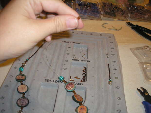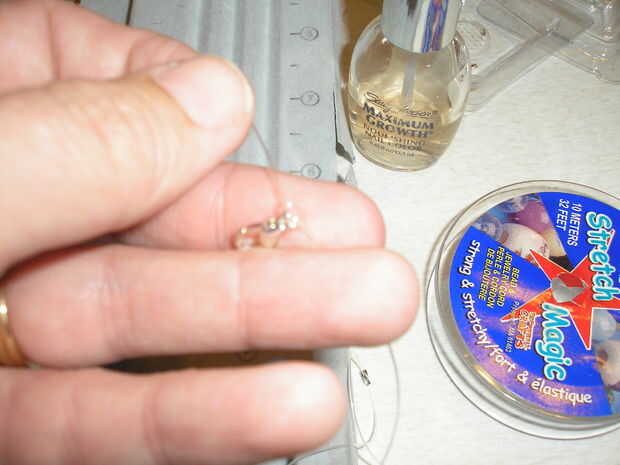 Se corta la cuerda más de lo que necesita, enrolle los extremos a través de los broches que están utilizando y adjuntar un pequeño clip de metal que mantiene el hilo de la mudanza. Abajo apriete con los alicates y debe llevar a cabo. Puede utilizar una aguja para facilitar el tendido pero yo no. También puede notar que usé dos broches para mi pulsera, hago esto porque lleve una etiqueta de alerta médica y me gusta Coloque a mis creaciones de abalorios.