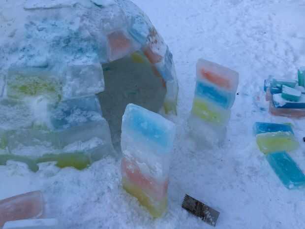 Empezamos con una columna a cada lado de la abertura. Estos fueron colocados sobre lejos un bloque el iglú. He probado el ancho entre las columnas para asegurarse de que fácilmente cabrían a un adulto.