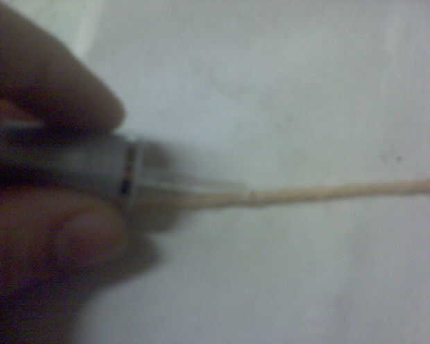 Ligeramente la pintura el hilado todo con el esmalte de uñas, he encontrado que color Polaco trabaja mejor. Cuando se tiene una buena capa, spinklke el esmalte húmedo con el motor de cohete. Asegúrese de que la mayor parte de palos. el papel por debajo de las capturas de exceso motor a ser utilizado de nuevo.
