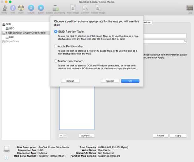 5. Haz clic en el botón "Opciones" abajo a continuación, seleccione "Tabla de particiones GUID".