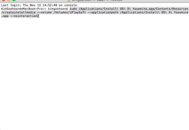 sudo/aplicaciones/Install\ OS\ X\ Yosemite.app/Contents/Resources/createinstallmedia--volumen/volúmenes/iPlaySoft--applicationpath aplicaciones/Install\ OS\ X\ Yosemite.app--nointeraction