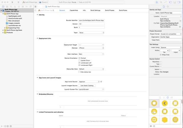 En la barra de herramientas superior en el lado izquierdo verá las palabras "Swift iPhone App". Junto a él, debe haber algo más de texto que cualquiera dice simplemente "dispositivo iOS" o un dispositivo como el iPhone 5, iPhone 6, etc.. Haga clic en este menú desplegable y seleccione iPhone 6. La selección "iOS dispositivo" no funcionará para usted (que es cómo subir tu aplicación a un dispositivo real para probar), sino que los simuladores.