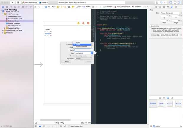 Antes de agregar un nombre, en la lista desplegable conexión seleccione acción. Mientras que los puntos de venta permiten obtener acceso al elemento de la interfaz de usuario (cambia su color de texto, texto, Fondo, etc.), las acciones son cómo usted interactuar con elementos interactivos como botones en el código. En esencia, brindan un puente interactivo desde la interfaz de usuario para el programa. Dentro de acciones puede decir al compilador que usted realmente quiere hacer algo. Por ejemplo, cuando un botón se golpea ligeramente puede decir el compilador para cambiar el color de fondo azul, pero cuando está golpeado ligeramente un botón diferente cambiar a rojo. Para el nombre, escriba buttonPress y haga clic en conectar. (Imágenes de 4 + 5)