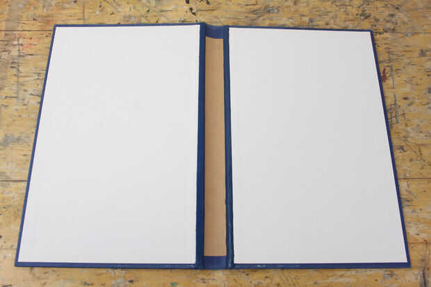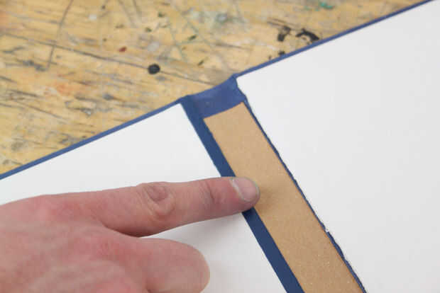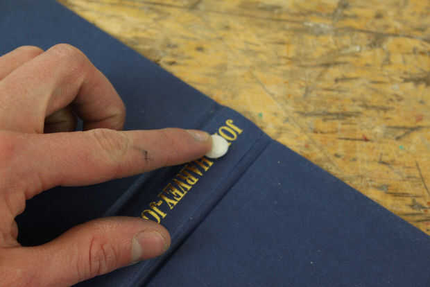 Después de alguna experimentación decidimos que la mejor manera de hacerlo era crear dos tiras de sugru que cubren los puntos donde las páginas habían unido a las cubiertas. Esto dio suficiente protección y había arreglado la columna sin usar demasiada sugru y no efecto en la apertura y cierre del libro.