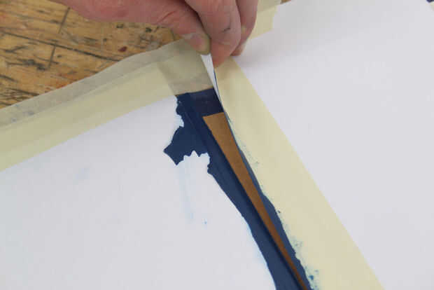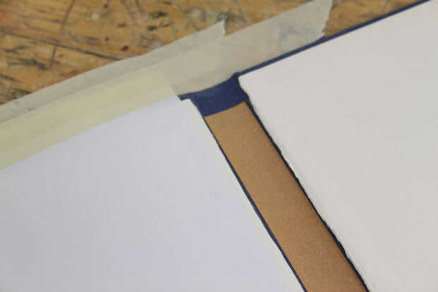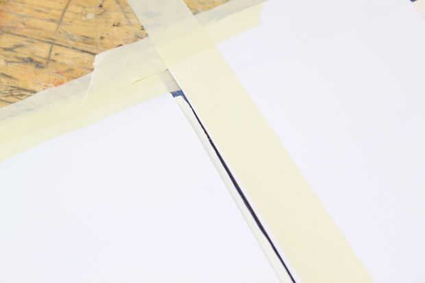 Dos piezas de papel a la máscara apagado una tira sobre la Unión. Para asegurar su no se mueve que utiliza tac blanco para pegar el libro a la mesa y luego cinta adhesiva para sujetar el papel colocado en la mesa, así. No queremos poner alguna cinta en el libro porque sería dañar el papel.