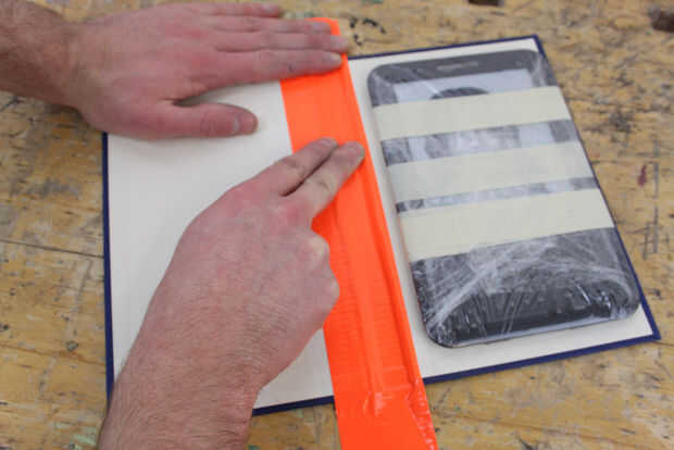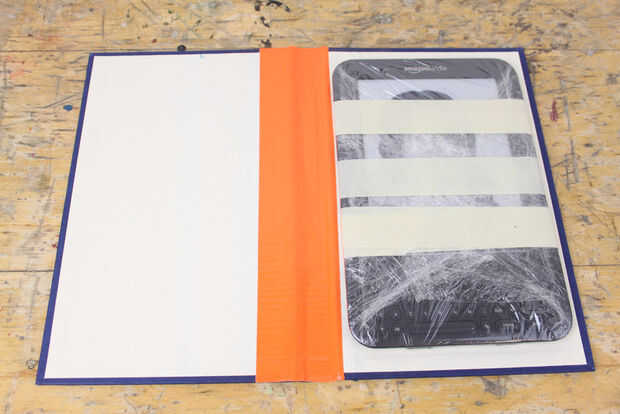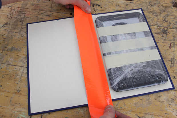 Como la cinta es probablemente probablemente sea mayor que la columna vertebral, asegúrese de que esté compensado por lo que cuando la tableta está en el lugar no está mintiendo sobre alguna cinta.