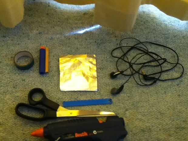 Sierra para metales de disco o segueta, tijeras pistola de pegamento caliente, optimizada o dardos nerf elite, pedazo corto de pasador, auriculares antiguos de estaño (opcionales, sólo para conectar iDevice cuando no en uso).