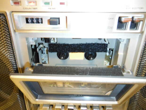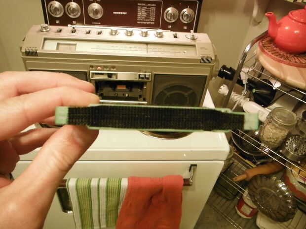 Ahora solo tienes que cortar unas pequeñas tiras de Velcro para pegar la cinta y cubierta. Necesita 4 en total. 2 para la cinta y 2 para la cubierta. Puede encontrar una manera diferente para este paso si usted quiere ser capaz de usar su magnetófono todavía. Yo no puedo garantizar que no afectará a la reproducción de la cinta.