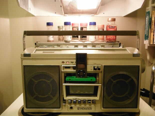 Ahora todo lo que tienes que hacer es poner el cassette con el cable aux que a través de él y montar el iPod. Entonces al cambiar su estéreo a la función de 'aux', tu iPod se juega a través de los altavoces! Sugiero voladura algunos Run DMC para celebrar. Entonces cuando es momento de ponerla lejos, tire el cable vuelve a salir a través de su cinta y pegarlo abajo de la zona pescan para arriba a través de la cubierta y poner su cinta en la cubierta para el transporte fácil!