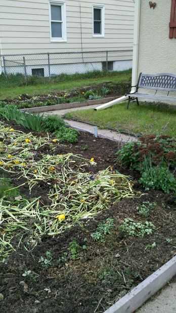 Utiliza un timón roto para romper la tierra. La casa fue construida en 1949, y dudo que había algo más que hierba en este sitio, por lo que tomó algún esfuerzo. Cuando se labra el suelo, pala compost en la parte superior y le ha permitido descomponer durante unas dos semanas. El compost que he añadido era de un programa local de jardín, y fue la consistencia de ricos para macetas suelo con tulip tallos y flores (y la bombilla ocasional).