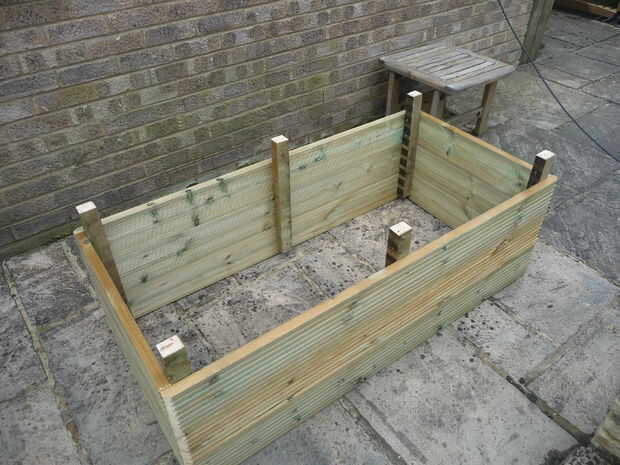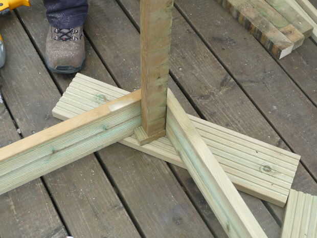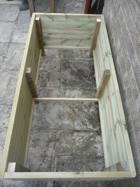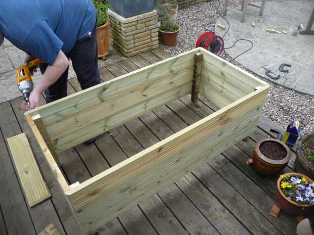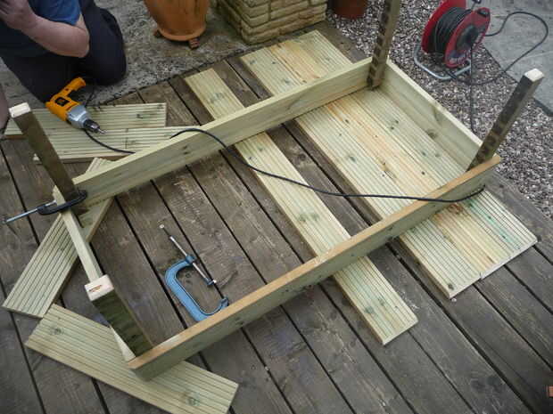 G. girar la maceta boca abajo otra vez - las piernas en el aire. Medir el espacio entre las patas de esquina en el lado largo, en nuestro caso se trataba de 1240 mm. pieza media este número y medida y marca en la parte inferior de la parte inferior a ambos lados. Este es el punto en que desea poner las piernas medianas. Recuerde compensar usando el sobrante y fíjela con los seis tornillos. Ver imagen 9 para la toma de la jardinera con las piernas medianas atadas.