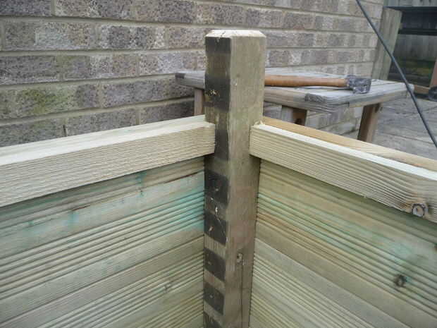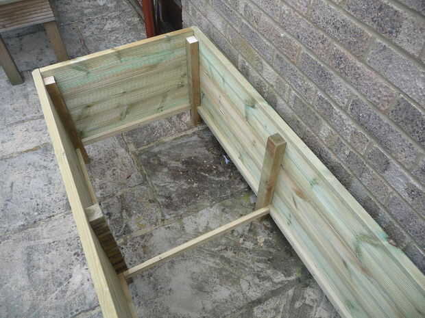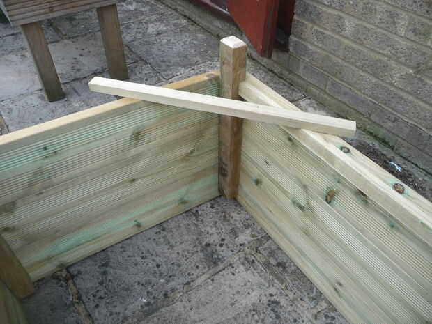 H. Corte las piezas delgadas de madera para hacer los soportes del listón por measureing la distancia entre cada una de las piernas. Vas a necesitar dos piezas y luego cuatro piezas laterales para entre una pata de la esquina, la media pierna y la otra pata de la esquina; en cada lado. Mucho más simple que esa frase es sonido! Ver imágenes de 10-14 para tiros de los soportes del listón en el lugar. Habíamos dejado una pieza sobre que era lo suficientemente larga para abarcar la jardinera, así que hemos añadido un apoyo adicional a través de la media - no es necesario y no sirve ningún propósito estructural, pero también puede utilizar la madera si se queda.