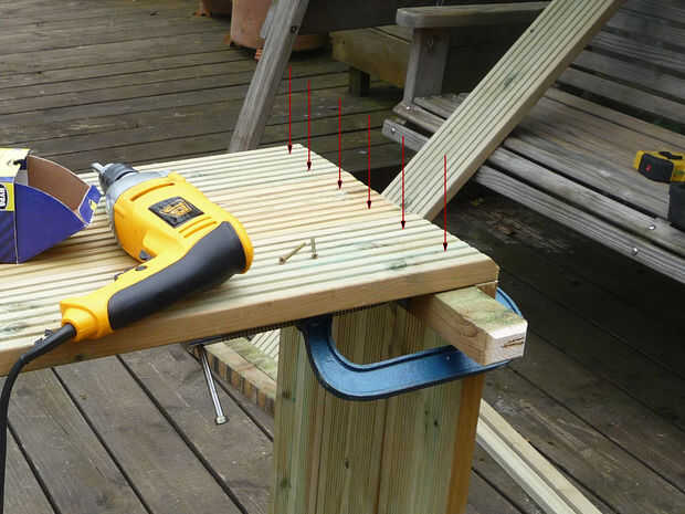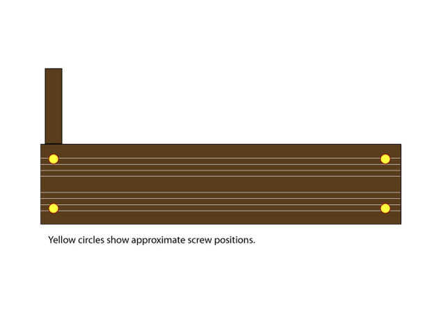 C. Atornille las esquinas de la tarima a las piernas. Debe haber un tornillo en cada esquina de los tablones de la plataforma. Ver imagen 4 posiciones aproximadas de tornillo.
