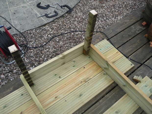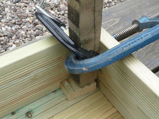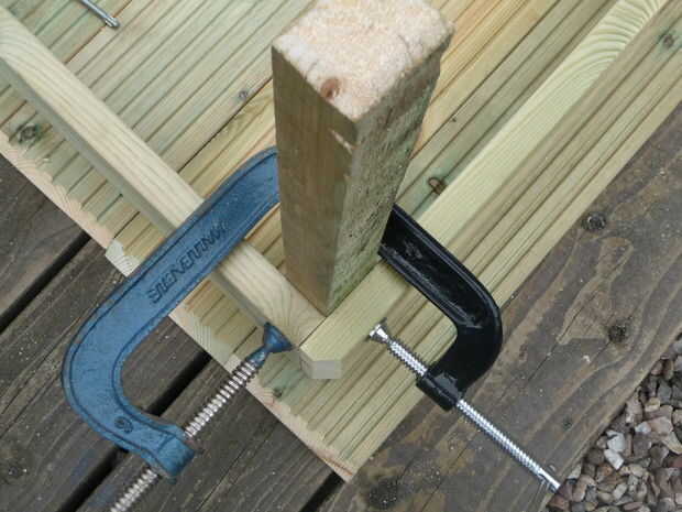 A. Haz tus abrazaderas listo, a continuación, extienda la primera esquina y pierna. Tomar un lado largo y un lado corto una pierna y colocarlos como se muestra en la imagen de abajo. Esto es boca abajo a la forma en que finalmente se sentará. Las astillas pequeñas debajo de la pierna es la pierna ligeramente por debajo de la parte superior de la maceta para que no puede ver desde el lado. Ver imagen 1.