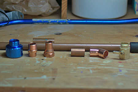 El tubo de cobre se corta en dos pedazos. Aproximadamente 36 pulgadas para el mango principal y cerca de 3 pulgadas para el final. Se puede ajustar por lo que es cómodo - hice un poco más largo que los tubos estándar para no tener que agacharse abajo como mucho.