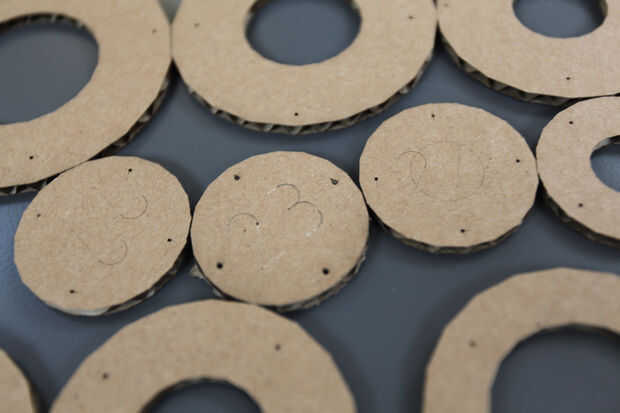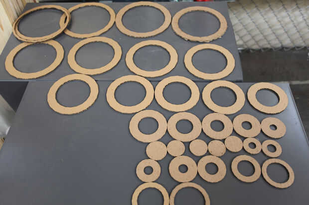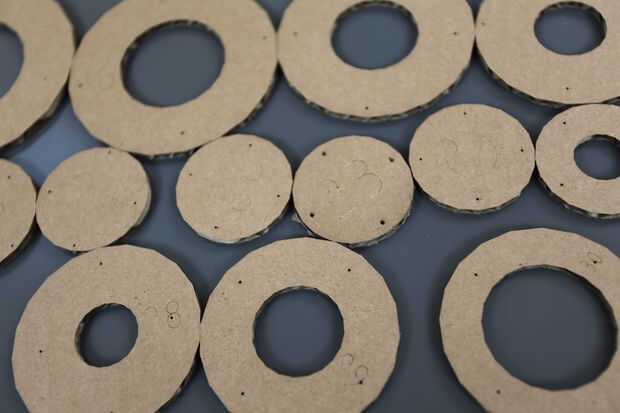 El cortador del laser me dio 34 círculos y anillos que se convertiría en mis partes. El 123D App hacer números sus piezas en el orden que van a ser capas. Organizar sus partes numéricamente para facilitar la construcción.