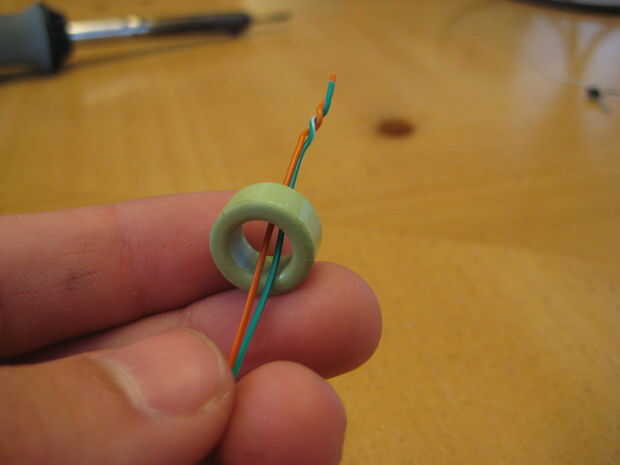 Tira de cierto aislamiento de los cables, luego tome un cable de cada lado, asegurándose de que son del COLOR opuesto. Girar juntos, y luego termine con el toroide.