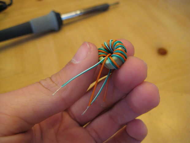 Enhebre el extremo torcido el toroide, luego tomar los otros dos extremos (no trenzados entre sí) y viento una vez alrededor del toroide. No tuerza los alambres; Asegúrese de que los dos cables del mismo color no están bien cerca unos de otros.