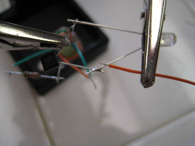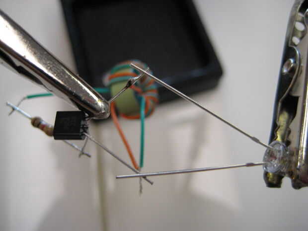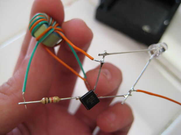 Tomar el otro cable solo de la toroide y suelde con el colector del transistor. Soldar el lado positivo del LED al coleccionista así y suelde el lado negativo para el emisor.