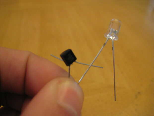En primer lugar, toma los dos cables exteriores del transistor y doble hacia fuera maneras un poco y doblar hacia atrás la cabeza media. El LED de la curva lleva hacia fuera, demasiado. No tienes que, pero facilita la soldadura.