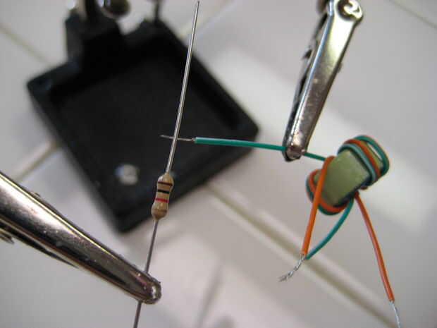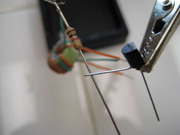 Uno de los cables provenientes de la toroide que está solo; es decir, no dobladas junto con otro cable. Soldadura a un lado de la resistencia. Suelde el otro extremo de la resistencia al plomo del medio del transistor.